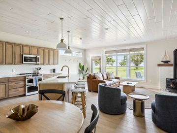 Our main level, condo-style units feature two comfortable bedrooms and sleeps 4-6. A full kitchen has everything needed to prepare and serve a delicious meal. They have a spacious bathroom with tiled shower and separate soaker tub. The dining space includes a dry bar with beverage fridge. A cozy family room with gas-burning fireplace and queen sleeper sofa walks out to a private patio with views of the lake and easy access to the resort property.