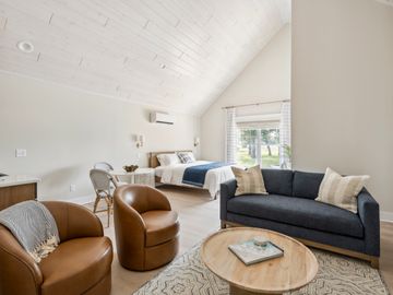 This whole cottage features four bedrooms, three bathrooms, including soaker tubs, a full kitchen, multiple living areas and private outdoor spaces. The home has a secure entry and the spaces are connected by a foyer and stairway. Sleeps up to 10 comfortably. Everything you need for a large family get-together or large group of friends!